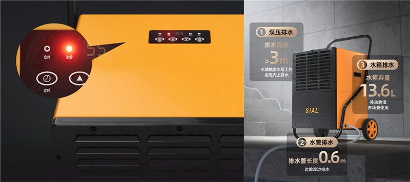 內置13.6L大容量水箱支持水滿報警自動停機功能,外接排水管可實現72小時無人值守運行,更配備水泵強制排水裝置,徹底解決地下倉庫排水坡度不足的難題。