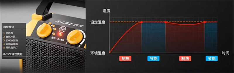 SIAL-PC2暖風(fēng)機(jī)擁有三檔調(diào)控功能,搭配0 - 35℃的溫控旋鈕,可實(shí)現(xiàn)智能恒溫控制。可以根據(jù)不同的環(huán)境溫度和個(gè)人需求,自由調(diào)節(jié)暖風(fēng)機(jī)的輸出功率和溫度,精準(zhǔn)掌控室內(nèi)溫度。當(dāng)室內(nèi)溫度達(dá)到設(shè)定值時(shí),暖風(fēng)機(jī)會自動進(jìn)入低功率運(yùn)行狀態(tài),保持溫度恒定,避免能源的浪費(fèi),真正做到節(jié)能省電。