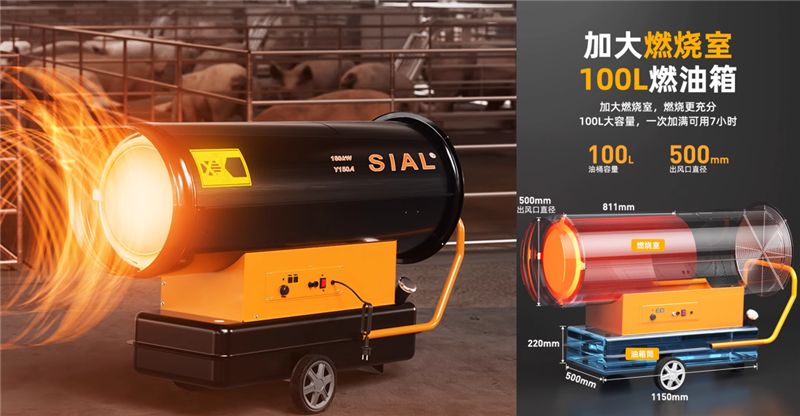 針對規模化養殖場連續作業需求,SIAL茜耳燃油暖風機配備100L超大容量燃油箱,滿油狀態下可連續運行7小時(按滿負荷計算)。其內置的智能燃油泵系統可根據環境溫度自動調節供油量,配合閉環燃燒控制技術,使燃油利用率提升20%,每立方米熱風成本較同類產品降低15%。